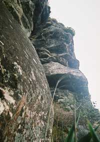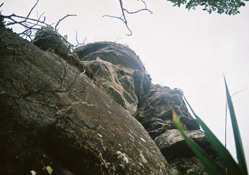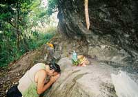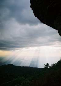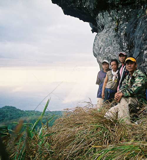 I readily admitted to myself that I did not have the strength I thought I had but knew I had to continue. Both my tri-pod and camera along with my backpack were taken over by Venh Xay, one of the Laotian climbers, who also became an invaluable aid to both my ascent and decent on Lingaparvata. I could not imagine how he could carry so much on his body with only wearing a simple pair of flimsy shower thongs. The sheer determination to continue climbing made everything else around me transform into some phantasmagorical landscape. The bird calls had a deep echoing tone which sounded like "a-tok-a-lok", "a-tok-a-lok" repeating endlessly and fading into the distant tree tops. The trees became so incredibly enormous both in height and width that I really did not believe I was on the same mountain. Caves appeared to recede endlessly into the mountains and rocky protrusions jutting out from the cliffs defied all sense of gravity. Serpentine vines of unbelievable thickness were hanging from tree in contorted spirals cork screwing themselves between every imaginable crevice and mountain stone.