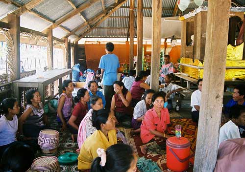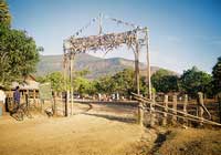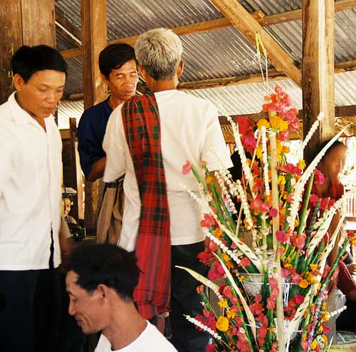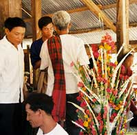 A person versed in the ancient Brahman chants would then call out "ma yoe khwan oye (Come spirit, Please Come)" and every one echoed the refrain together. A special flower branch would then be dipped in Lao whiskey and sprinkled on everyone in the ceremony. At the end of the chanting everyone picks a cotton string from the cone and ties it to a personÕs wrist to keep the spirit within the body of the person and leaves it on for three days. This was a most memorable occasion for me to experience the warm feelings of all the villagers of Nong Duen. After the ceremony all the villagers prepared many different Lao food dishes and it was truly a time of healing and rejuvenation.