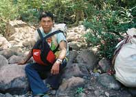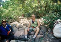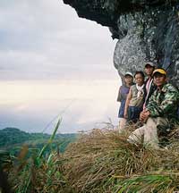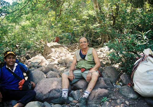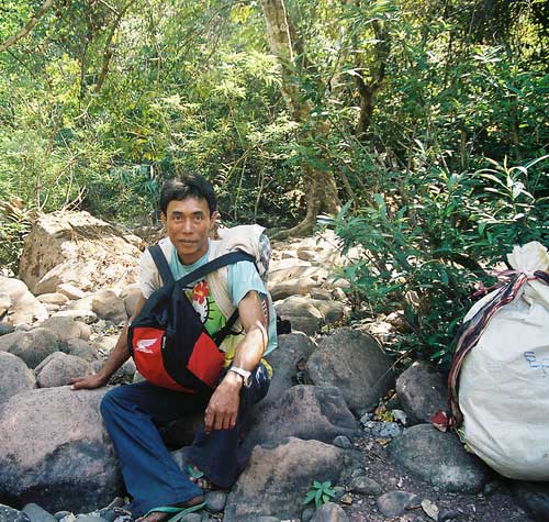 At first I thought it would be very disturbing to have so many people going on a climb up this sacred mountain. But I soon learned that it took at least thirteen Laotian men to carry all the necessities to camp out on the mountain for one night. Not only were there carriers of the necessary supplies but at least six Laotian men who carried M16 and AK47 rifles acting as the advance guard who left a day early to clear the path of any wild animals and protect all of us in the evening. It took walking about 2km through open rice fields before we disappeared under the canopy of trees leading to the top of the mountain. At this point I was totally unprepared for what was about to follow. I clearly remembered climbing to Vat Oubmong and Tham Lek cave with Bountham and Chansavang on my 2nd visit to Vat Phu so I thought I was somewhat prepared for the difficulty of the climb up Lingaparvata. I wasnÕt. Slowly the climb up Lingaparvata became an ordeal of physical determination which taxed every amount of energy I possessed. The Laotian men, however, carrying what seemed to me to be impossible loads nimbly picked their way over stone after stone with only thongs for foot wear.