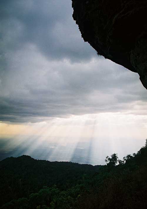 The rays of the setting sun were streaming through the clouds like so many golden shafts of light creating a curtain of luminescence as far as the eye could see. It was like standing on top of the world. Vanh Xay made sure my footing did not go though the holes underneath the thick mountain grass and it was all too obvious that nobody had been here for a very long time judging by the growth of all the plants and trees.